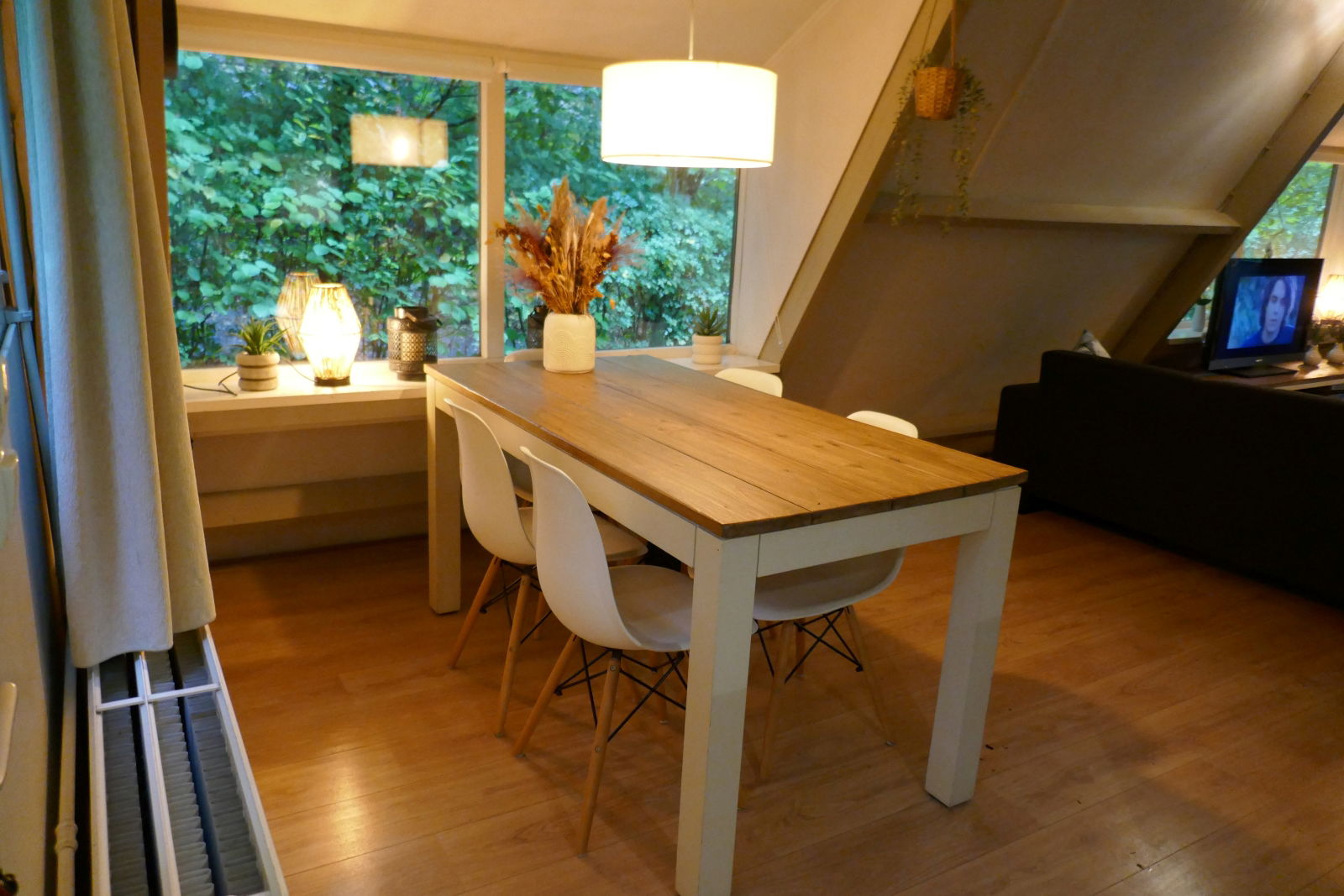 Welkom in onze gezellige woning! In de woonkamer vind je een sfeervol eetgedeelte met plaats voor vijf personen. De open keuken is volledig uitgerust met een koelkast met vriesvak, oven, magnetron, traditioneel koffiezetapparaat, een waterkoker én een Nespresso machine. Koffie, thee …